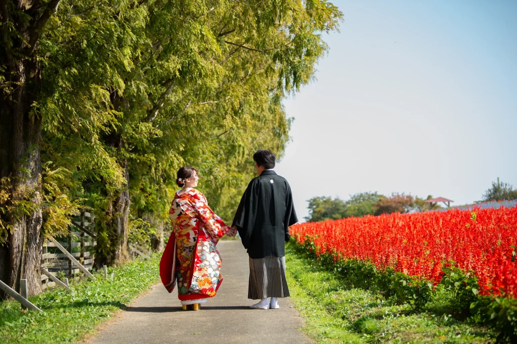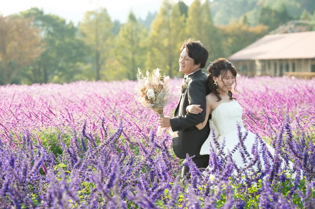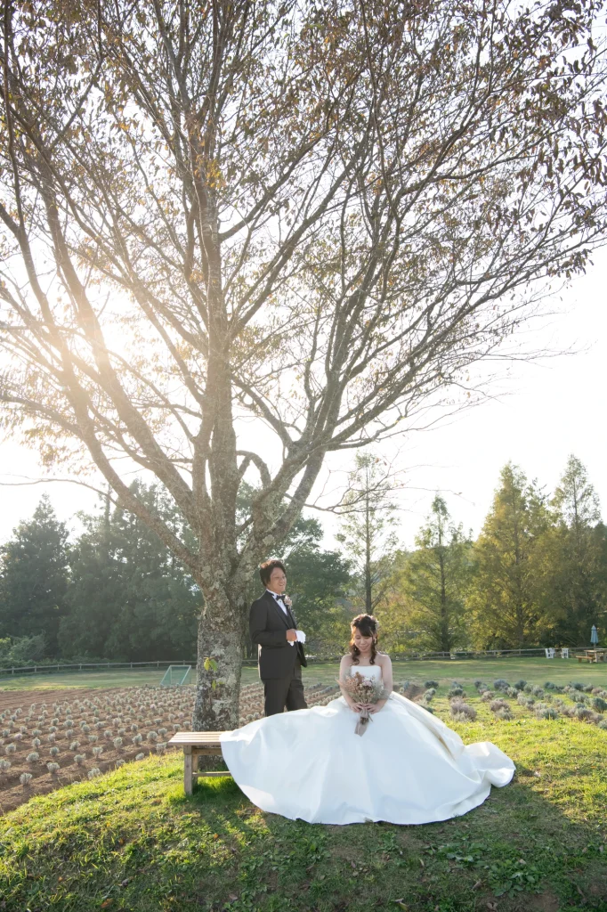 お花が大好きな新婦様が前撮りのロケーションに選ばれたのは、三重県伊賀市にある「メナード青山リゾート」。標高600mに位置し、100万坪の広大な敷地を誇る自然豊かなリゾート地です。今回の撮影では、色とりどりの可憐な花々に囲まれたハーブガーデンにて撮影を実施。年間300種類以上のハーブが育つこのガーデンでは、花やハーブの摘み取り体験もでき、五感で自然を感じられる特別な場所です。青空と緑の大地、そして鮮やかな山々が織りなす風景は、ドレス姿のおふたりをより一層美しく引き立ててくれました。メナード青山リゾートならではの澄んだ空気と心癒される香りの中で、リラックスした雰囲気のまま自然体で撮影が進み、笑顔あふれる素敵な時間となりました。花に囲まれた前撮りやフォトウエディングをお考えの方には、四季折々の彩りが楽しめるこのロケーションはぜひおすすめです。