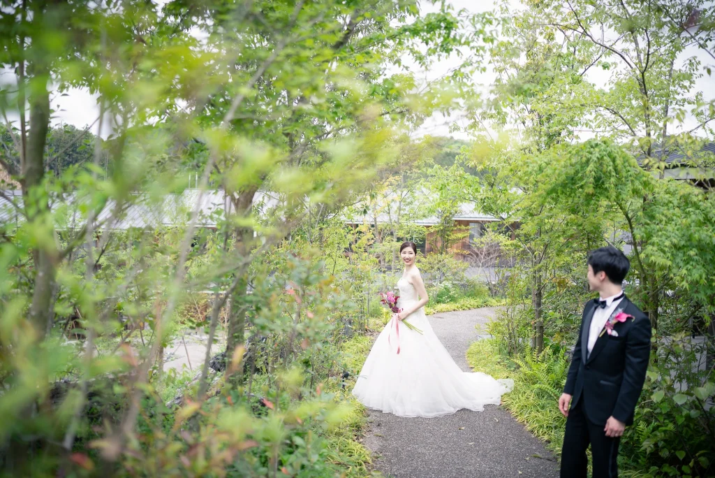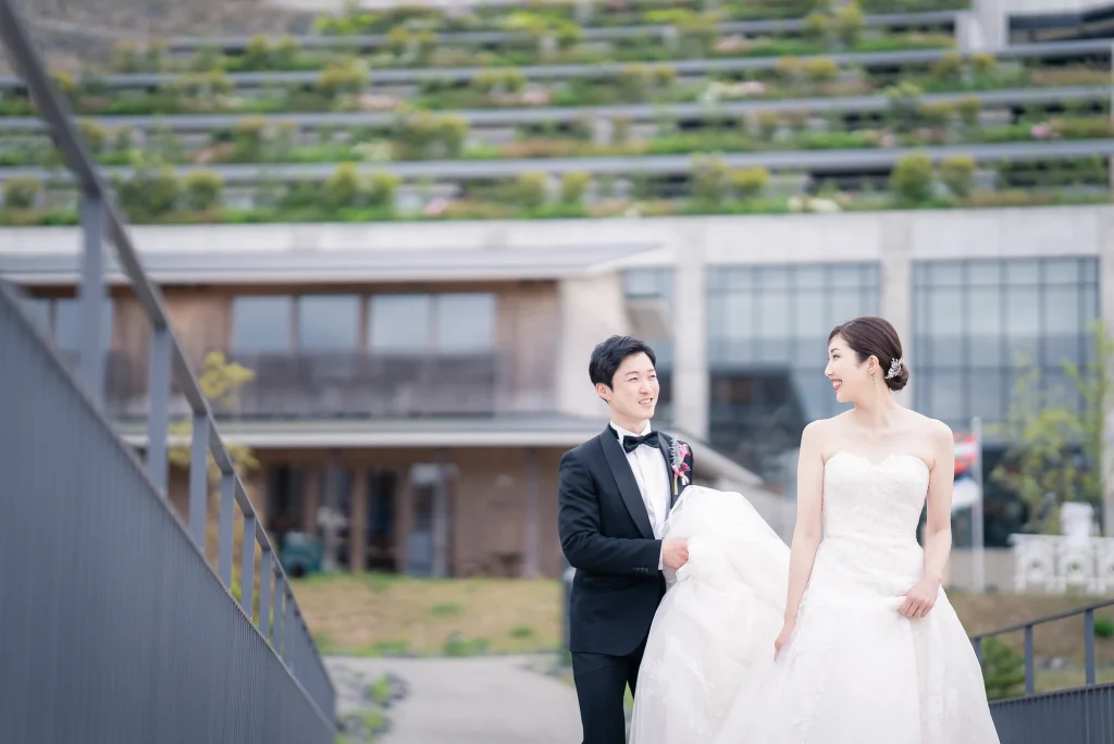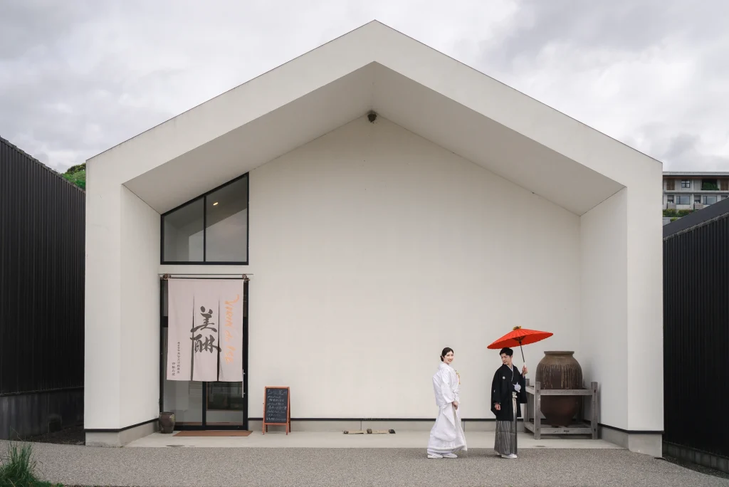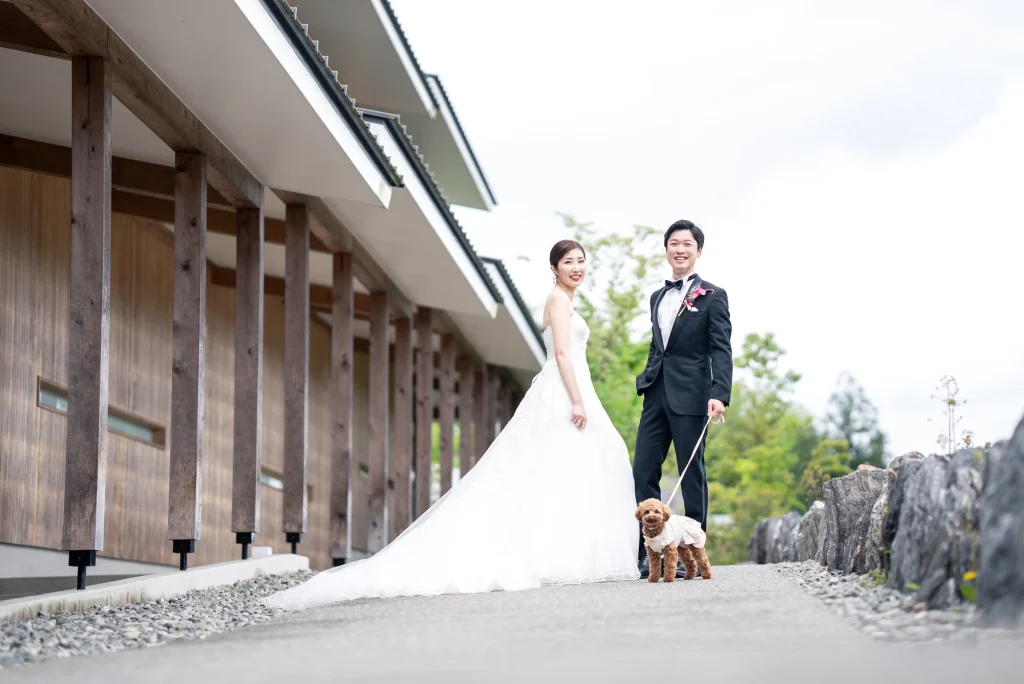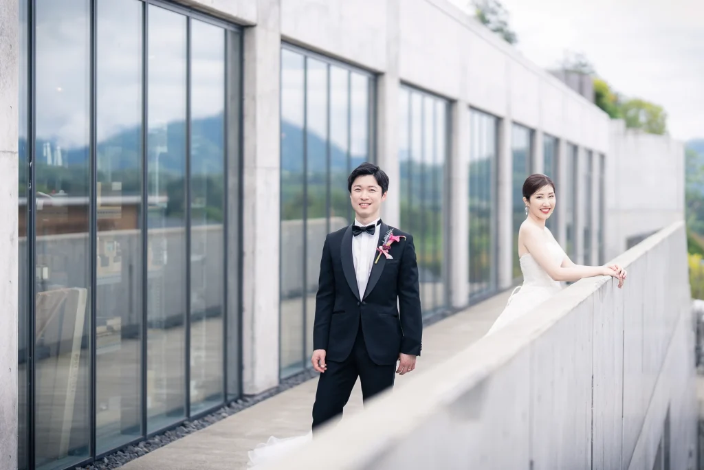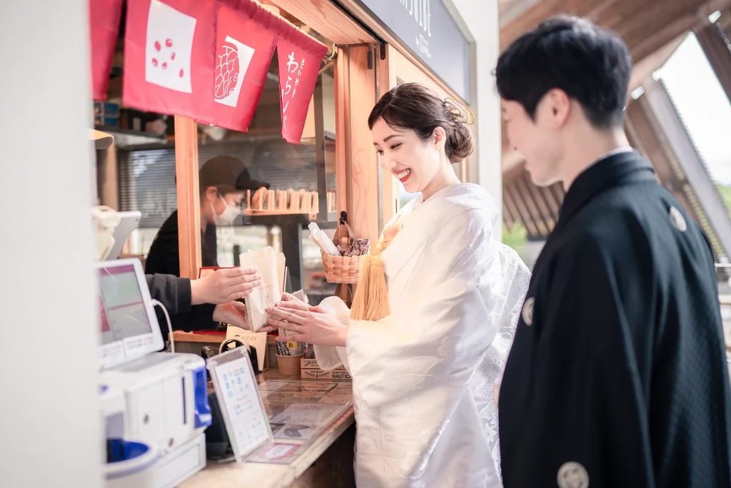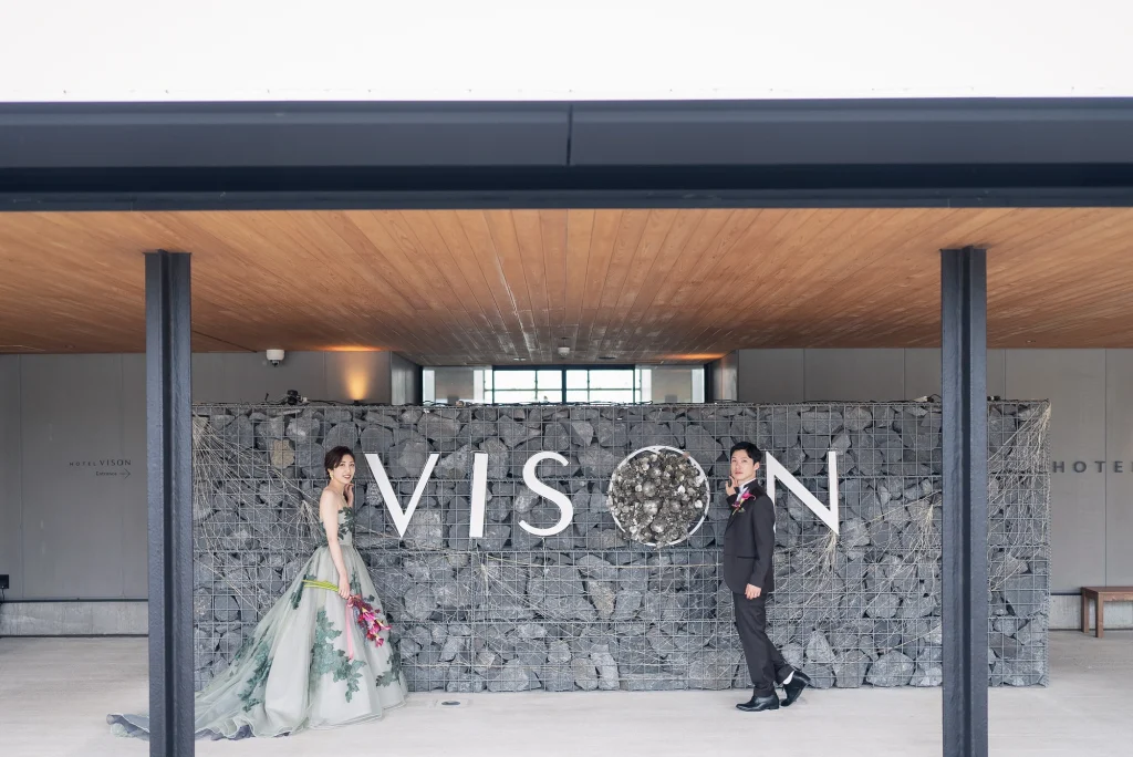 「旅先で一生の思い出に残るフォトウエディングを」というご希望からご提案させていただいたのは、多気町にある日本最大級の商業リゾート「VISON(ヴィソン)」。東京ドーム24個分もの広大な敷地には9つのエリアが広がり、その中でも今回撮影を行った「マルシェ ヴィソン」は、世界最大級の国際デザインコンペティションでも受賞歴を持つ注目のスポットです。今回は白無垢、ウエディングドレス、カラードレスの3種類のお衣裳でロケーション撮影を実施。和の雰囲気とモダンさが調和した空間は、どのお衣裳にもぴったりで、おしゃれで洗練されたフォトウエディングが叶いました。自然・建築・文化が融合するVISONは、非日常感とスタイリッシュな雰囲気が魅力。三重県でフォトウエディングをご検討の方には、バリエーション豊かな撮影が楽しめるVISONでの撮影を心からおすすめします。