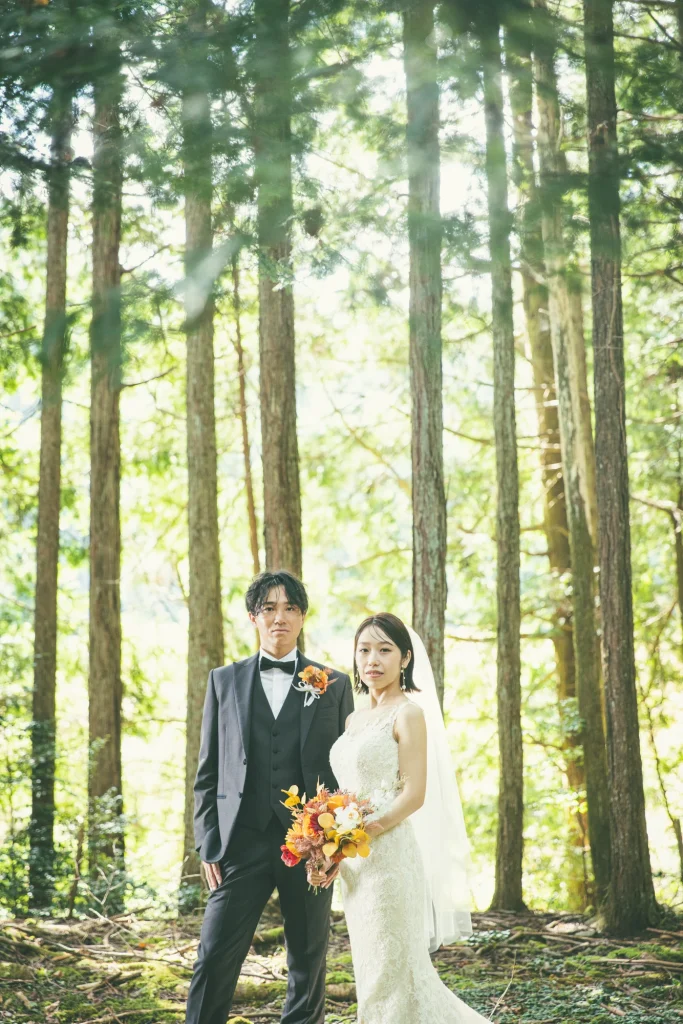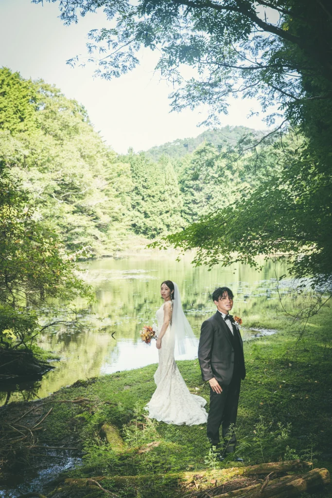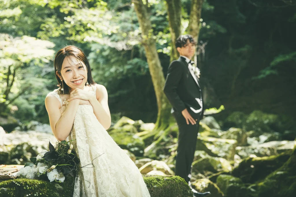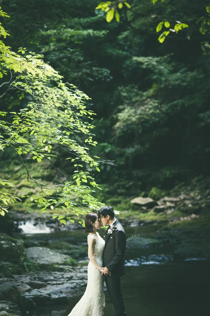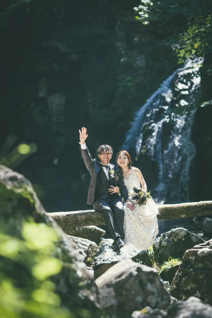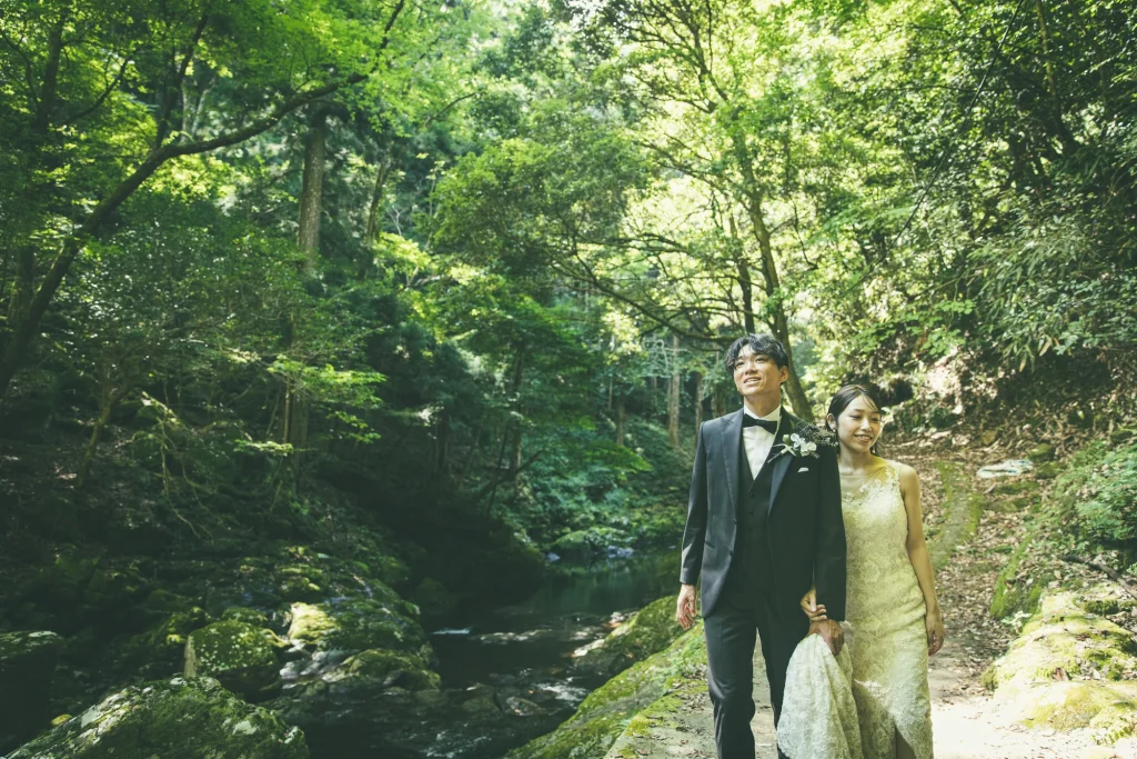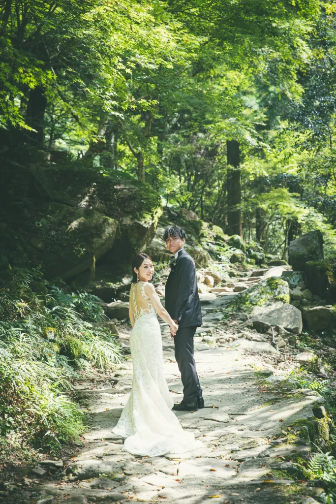 三重県名張市にある「赤目四十八滝」は、国の名勝にも指定されている自然豊かな名所。今回はその赤目四十八滝にて、前撮り撮影を行わせていただきました。エメラルドグリーンに輝く清流と、木漏れ日が美しく調和する幻想的な空間は、まるで物語の中に迷い込んだようなロケーション。岩場や滝、森林など多彩な撮影スポットが点在し、季節を問わず美しい一枚が残せる人気のフォトウエディングスポットです。特に春から夏にかけては緑が鮮やかで、大自然の息吹を感じながらの撮影にぴったり。この日も自然とドレスが絶妙にマッチし、おふたりの笑顔がより一層輝いて見えました。赤目四十八滝での撮影は、非日常の中で特別な思い出を形に残したい方におすすめ。三重でフォトウエディングをご検討中の方は、ぜひ一度訪れていただきたい絶景スポットです。