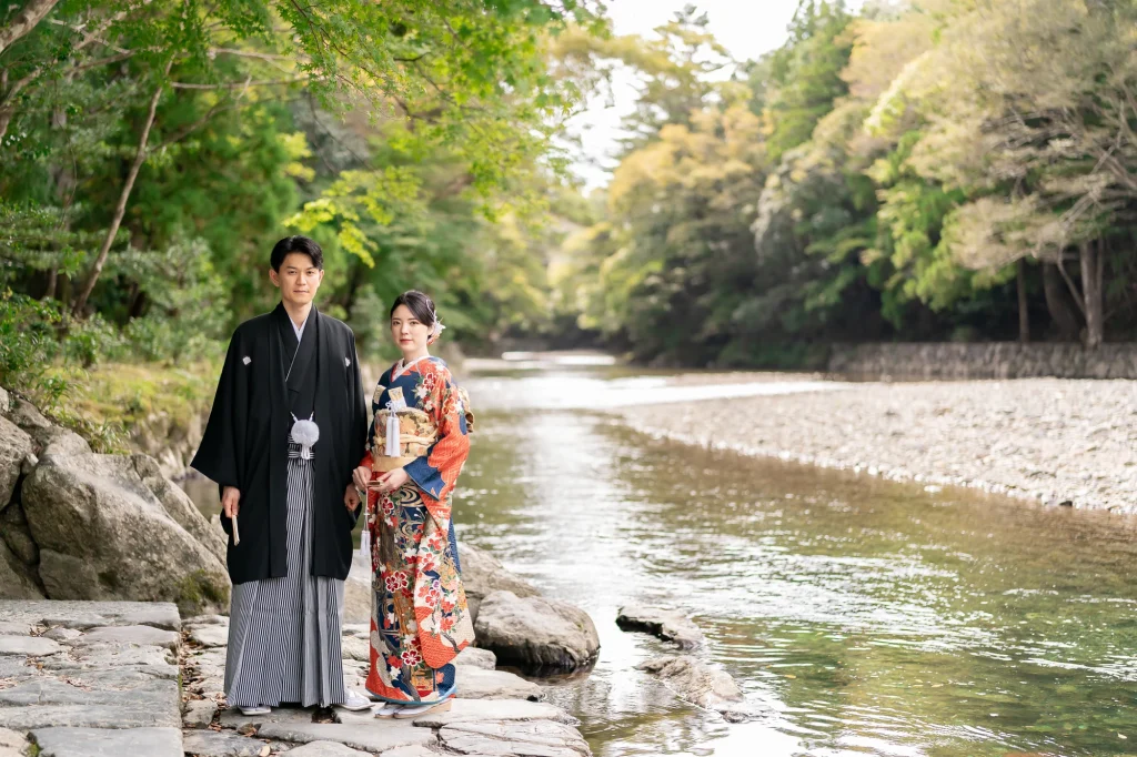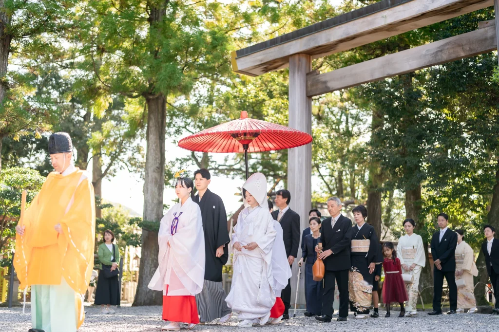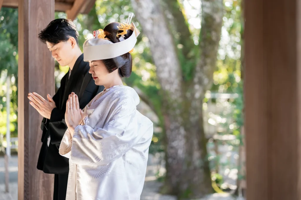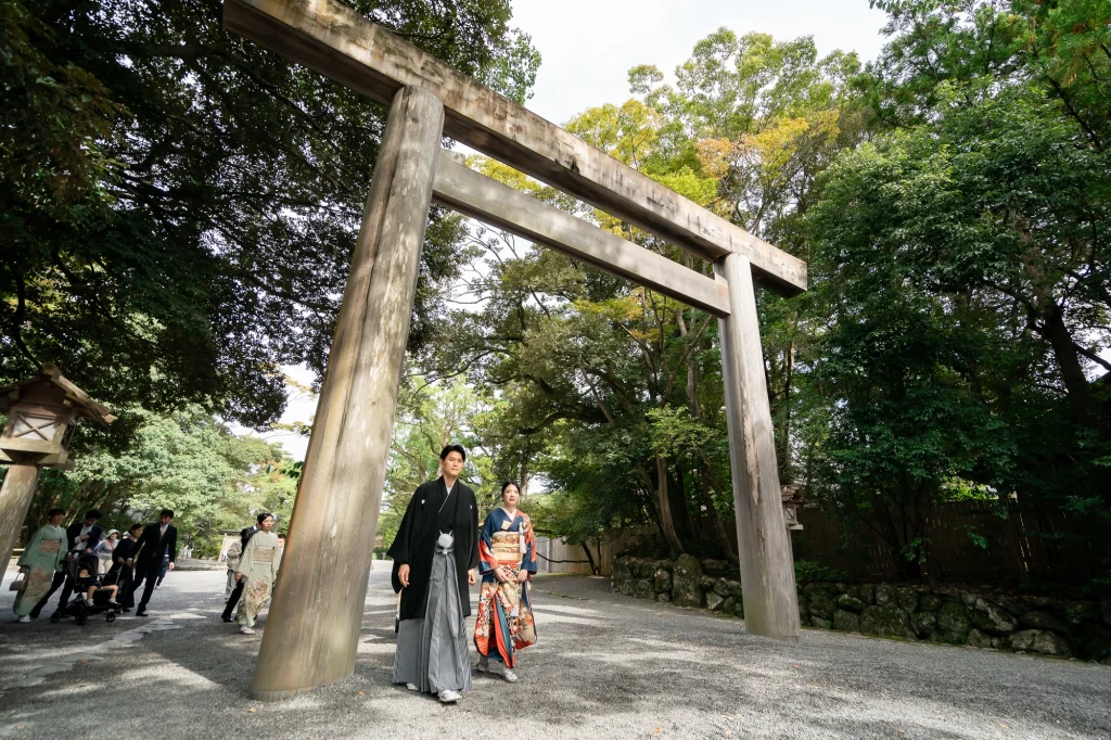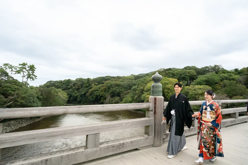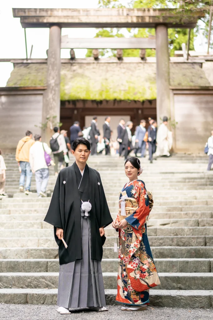 県外にお住まいのお二人が選ばれたのは、伊勢での本格的な和婚スタイル。前日は伊勢の人気観光地「おかげ横丁」での前撮りを楽しまれ、情緒あふれる街並みで笑顔あふれる写真をたくさん残されました。結婚式当日は、由緒ある猿田彦神社にて厳かな神前式を執り行い、その後、伊勢神宮での入籍奉告をされました。新婦様は「白無垢×鬘」の正統派和装スタイルを強くご希望され、その美しさはまさに日本の花嫁。伊勢神宮の案内ツアーも心待ちにされていたお二人にとって、伊勢でのひとときは一生の思い出になったと嬉しいお言葉をいただきました。伝統と旅の魅力が詰まった伊勢の和婚は、特別な一日をより深く彩ります。