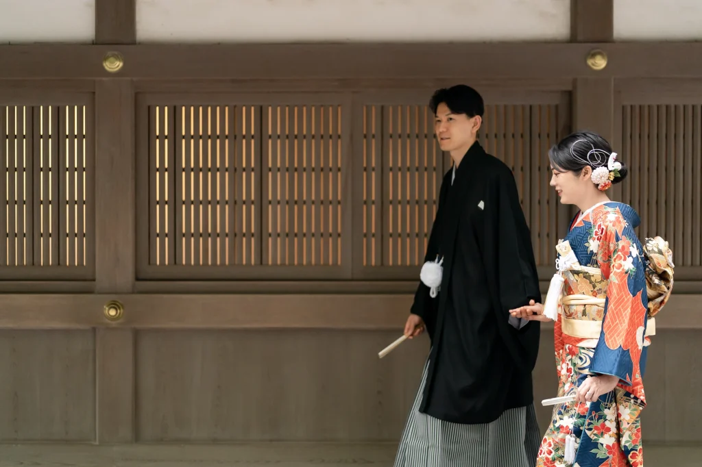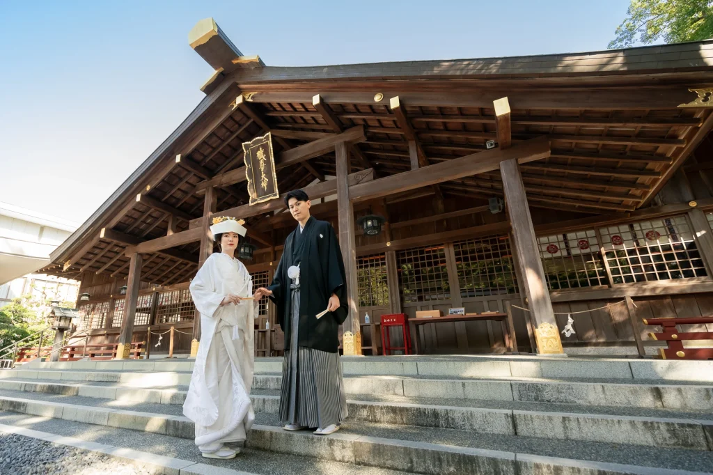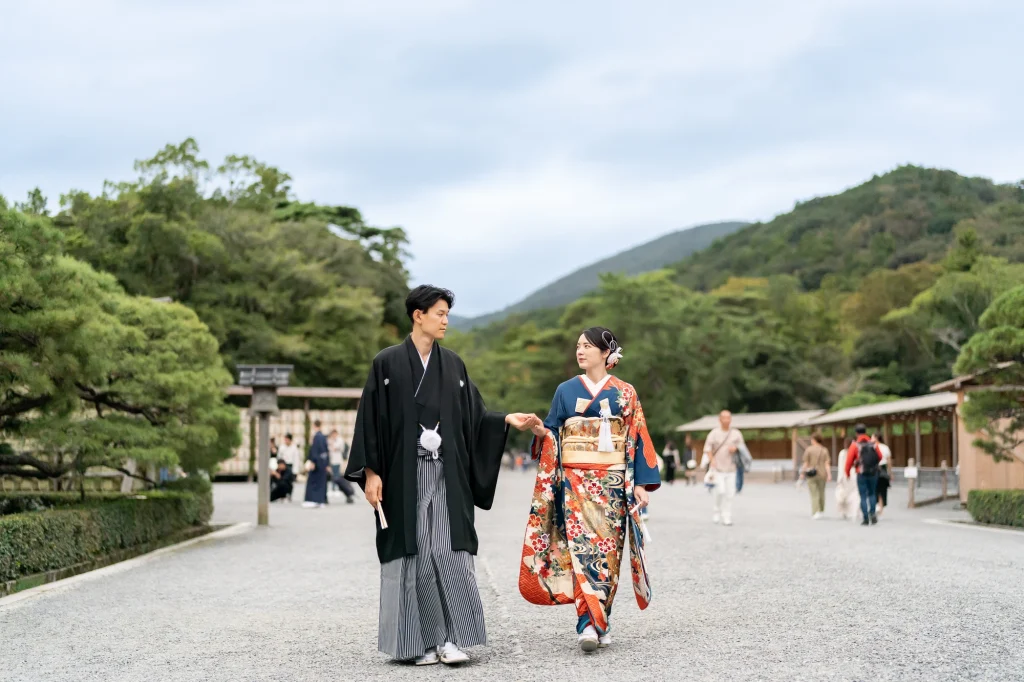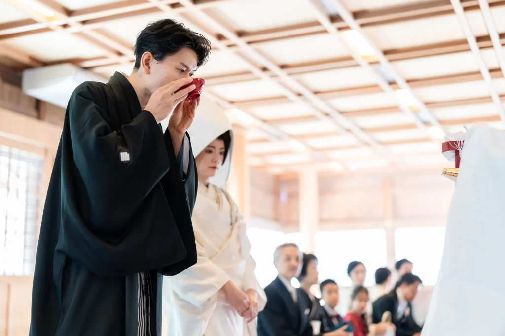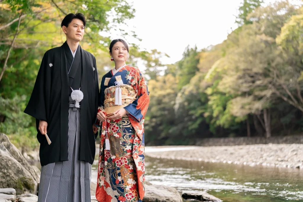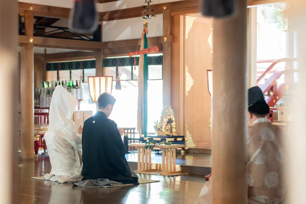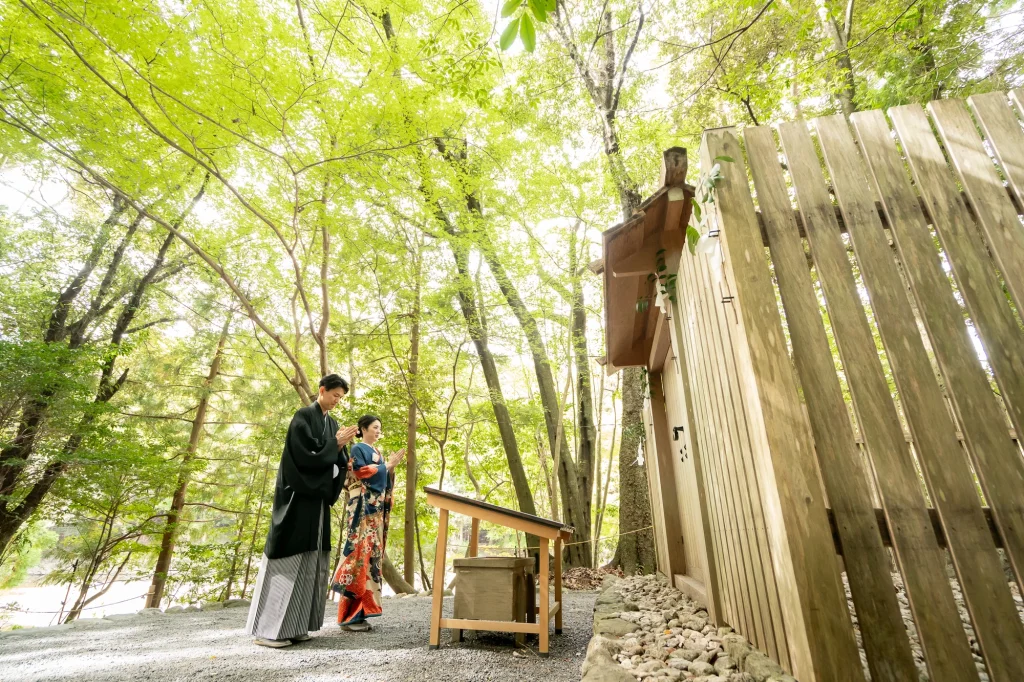 県外にお住まいのお二人が選ばれたのは、伊勢での本格的な和婚スタイル。前日は伊勢の人気観光地「おかげ横丁」での前撮りを楽しまれ、情緒あふれる街並みで笑顔あふれる写真をたくさん残されました。結婚式当日は、由緒ある猿田彦神社にて厳かな神前式を執り行い、その後、伊勢神宮での入籍奉告をされました。新婦様は「白無垢×鬘」の正統派和装スタイルを強くご希望され、その美しさはまさに日本の花嫁。伊勢神宮の案内ツアーも心待ちにされていたお二人にとって、伊勢でのひとときは一生の思い出になったと嬉しいお言葉をいただきました。伝統と旅の魅力が詰まった伊勢の和婚は、特別な一日をより深く彩ります。