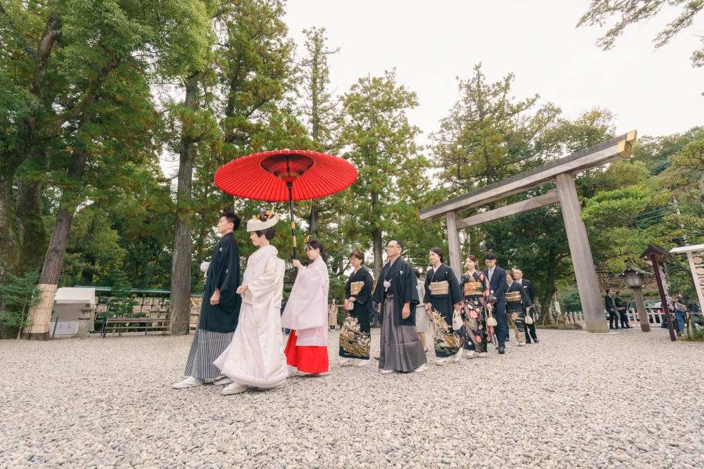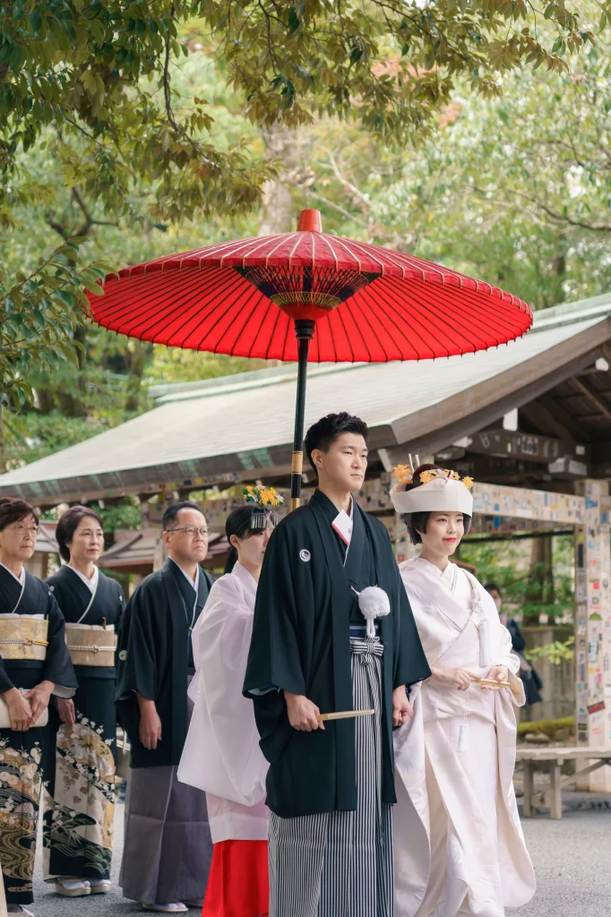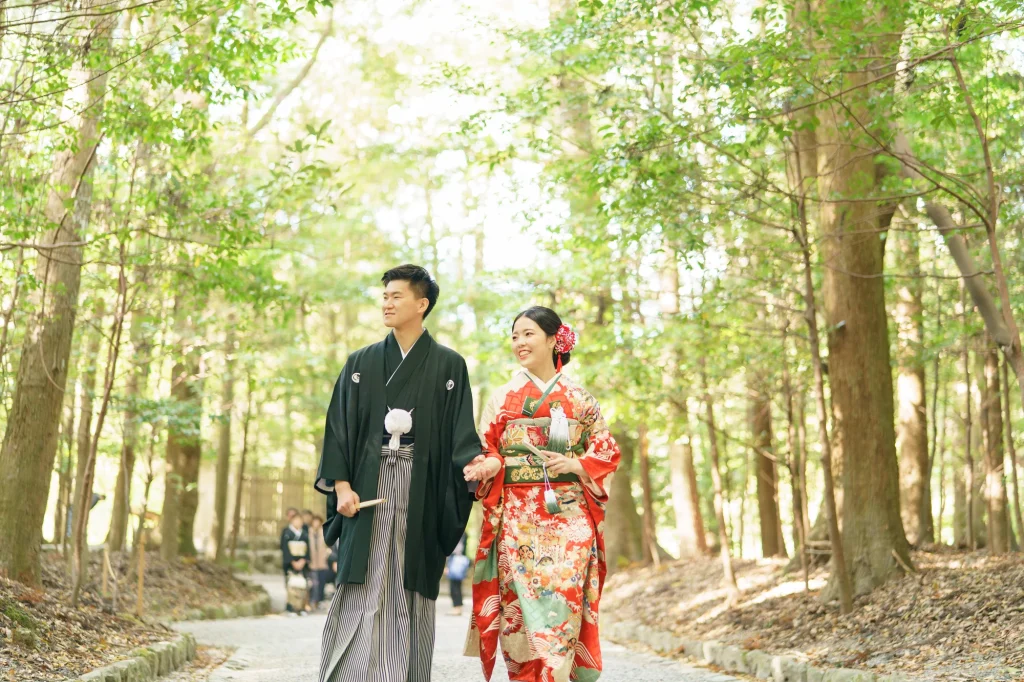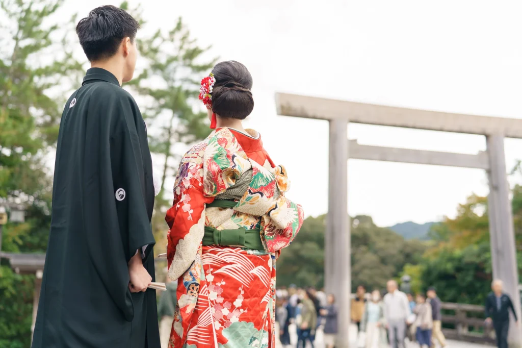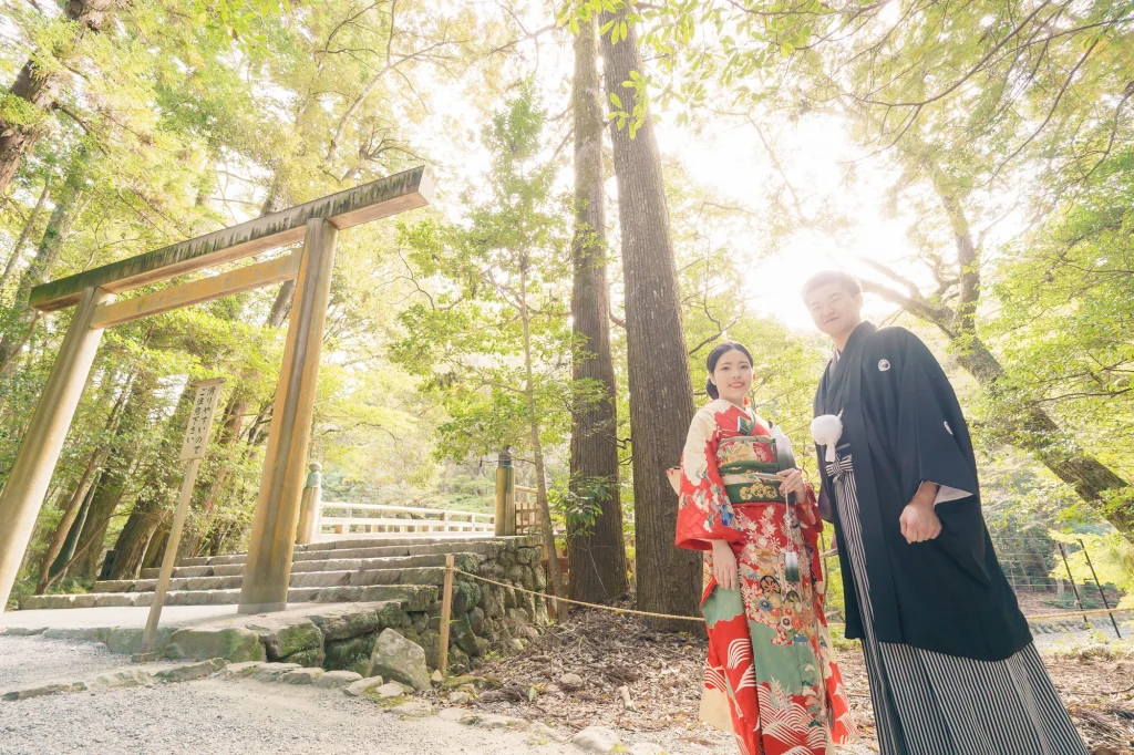 伊勢にある猿田彦神社で結婚式を挙げられた新郎新婦様。最近ではドレスでの挙式も多い中、おふたりは伝統的な白無垢姿で神前式を選ばれ、日本の美しい結婚文化を大切にされていることが印象的でした。厳かな雰囲気の中、ご家族に見守られながら、心に残る和婚を叶えられました。挙式後は、伊勢神宮へ結婚のご奉告参拝へ。新婦様はご自前の振袖にお着替えされ、人生最後となる花嫁姿の振袖で、ご家族との大切な時間を丁寧に過ごされました。伊勢の自然と歴史に包まれた一日は、おふたりだけでなくご親族にとっても忘れられない思い出に。伊勢での白無垢の結婚式や神前式、和装での伊勢神宮参拝を検討されている方には、ぜひ参考にしていただきたい素敵な一日でした。