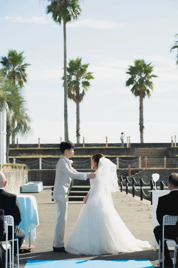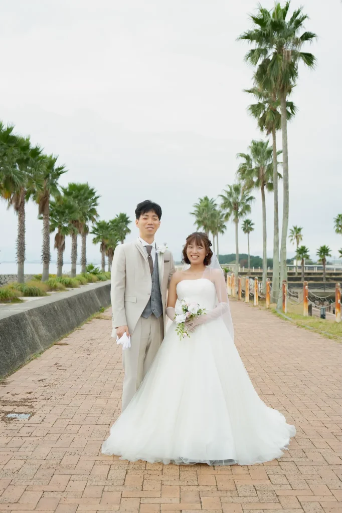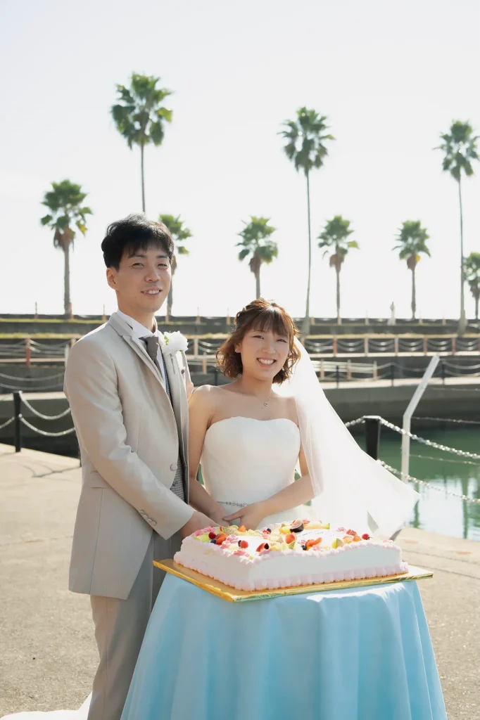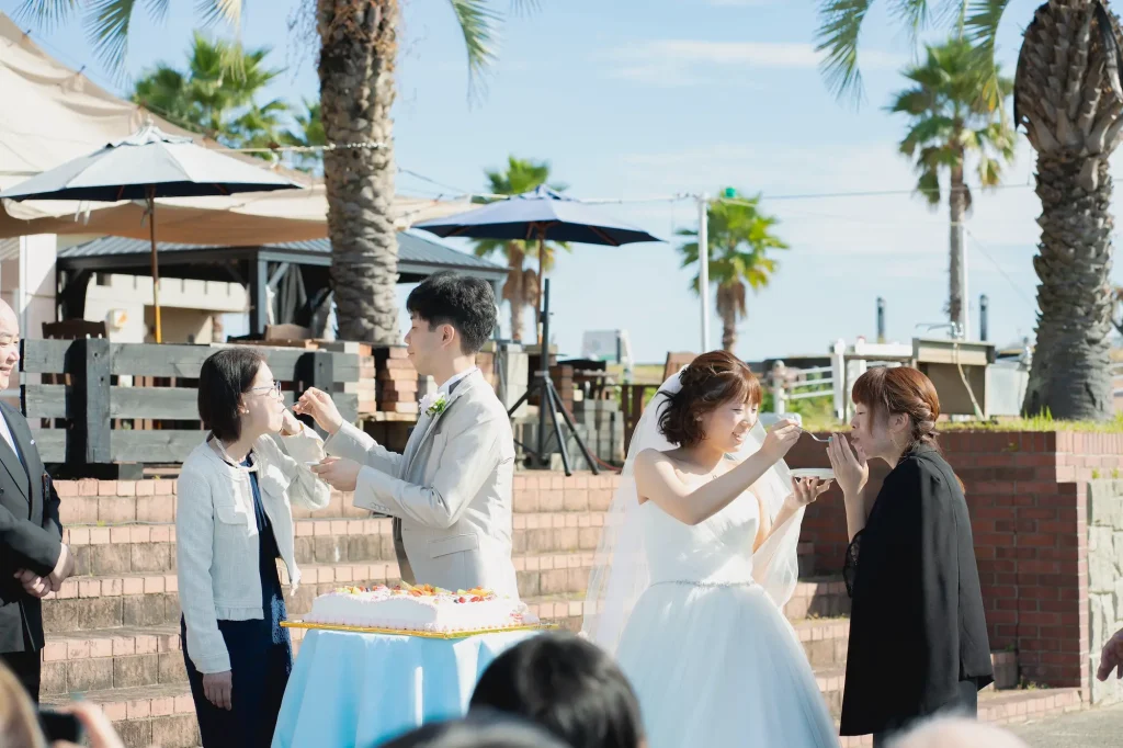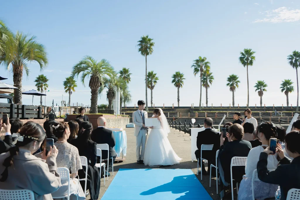伊勢湾を望む開放的なロケーションが魅力の「マリーナ河芸」にて、屋外ウエディングをプロデュースさせていただきました。ヤシの木が並ぶ南国リゾートのような雰囲気の中で行われたお式は、まさに非日常そのもの。青空の下、おふたりの晴れ姿がより一層輝いて見えました。挙式の中には、ファーストバイトやサンクスバイトなど、おふたりならではの演出を取り入れ、笑顔と感動があふれる時間に。ご家族やご友人と共に過ごすひとときは、とても温かくアットホームな雰囲気に包まれていました。そして挙式後には、ゲストの皆さまと一緒にバーベキューを楽しむというマリーナ河芸ならではの演出も!潮風を感じながら、美味しいお料理と会話に花が咲き、最後まで笑顔が絶えない一日となりました。自然の中で叶える自由なスタイルの結婚式が、おふたりの特別な思い出になったことと思います。