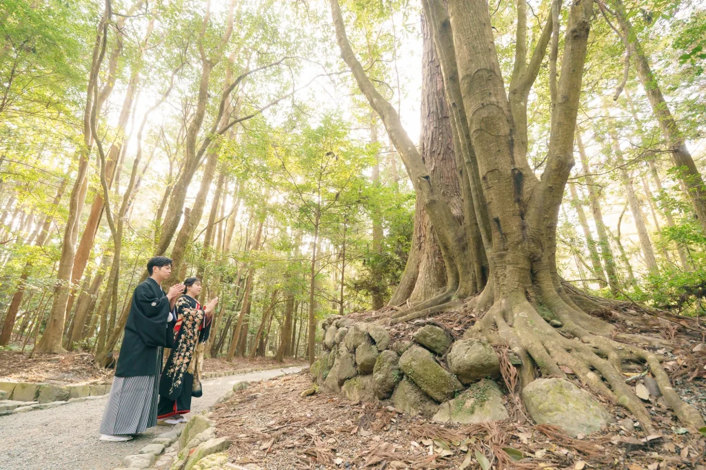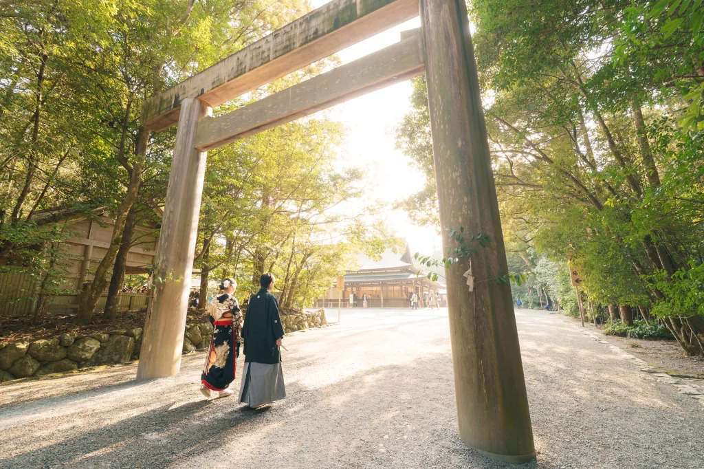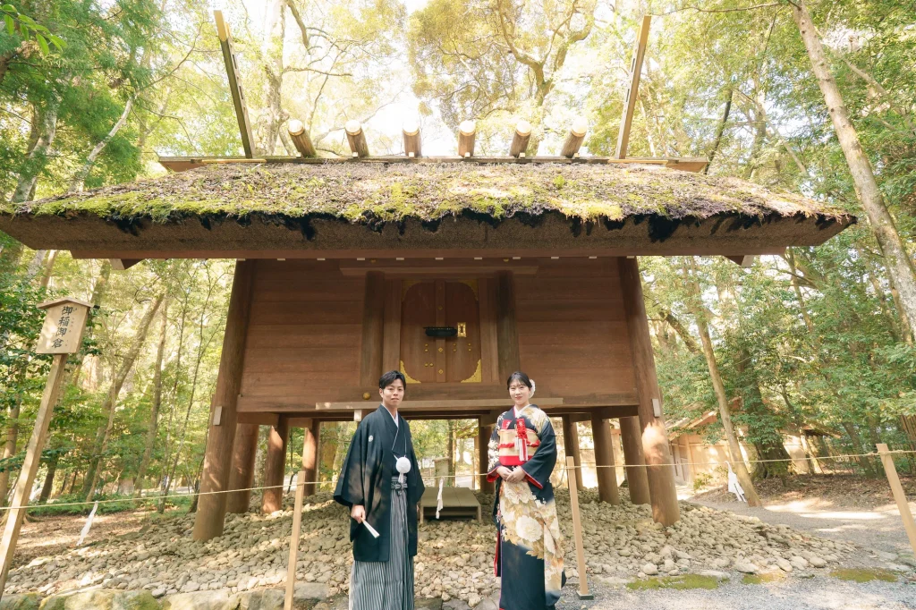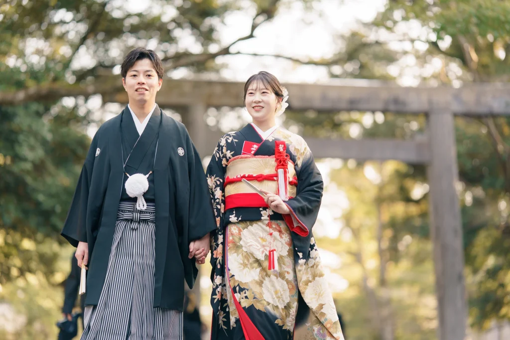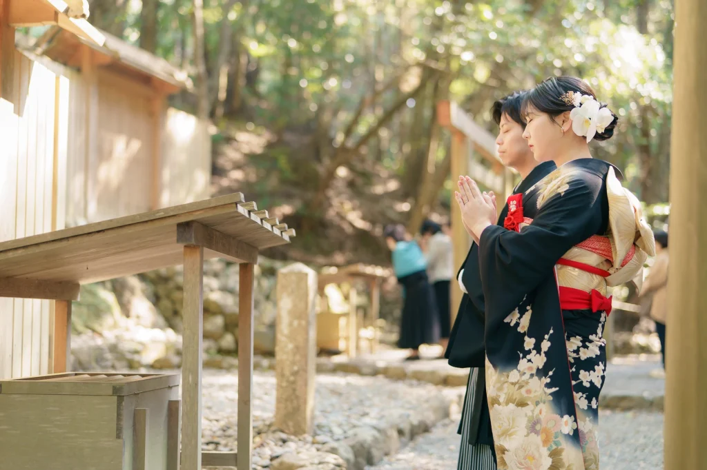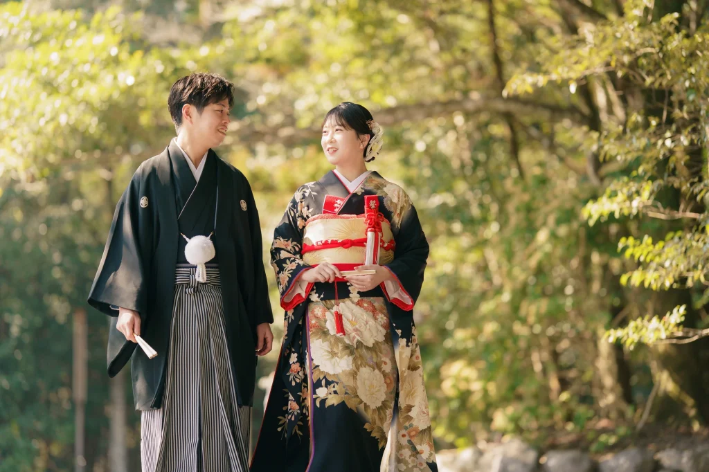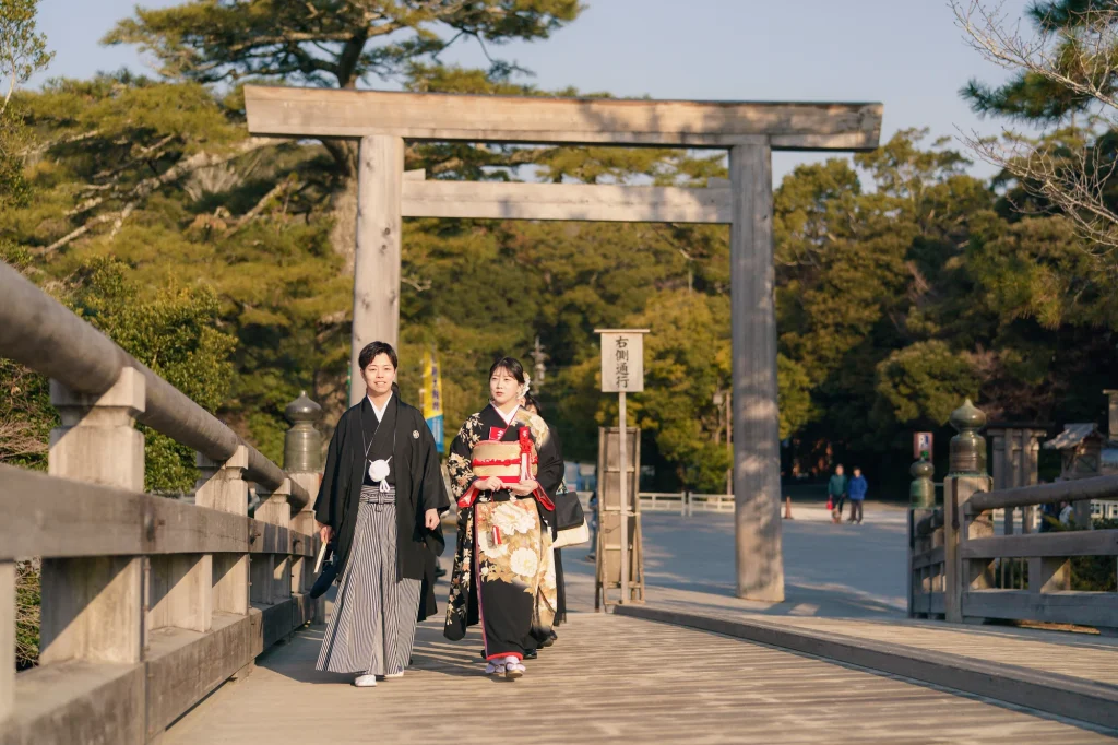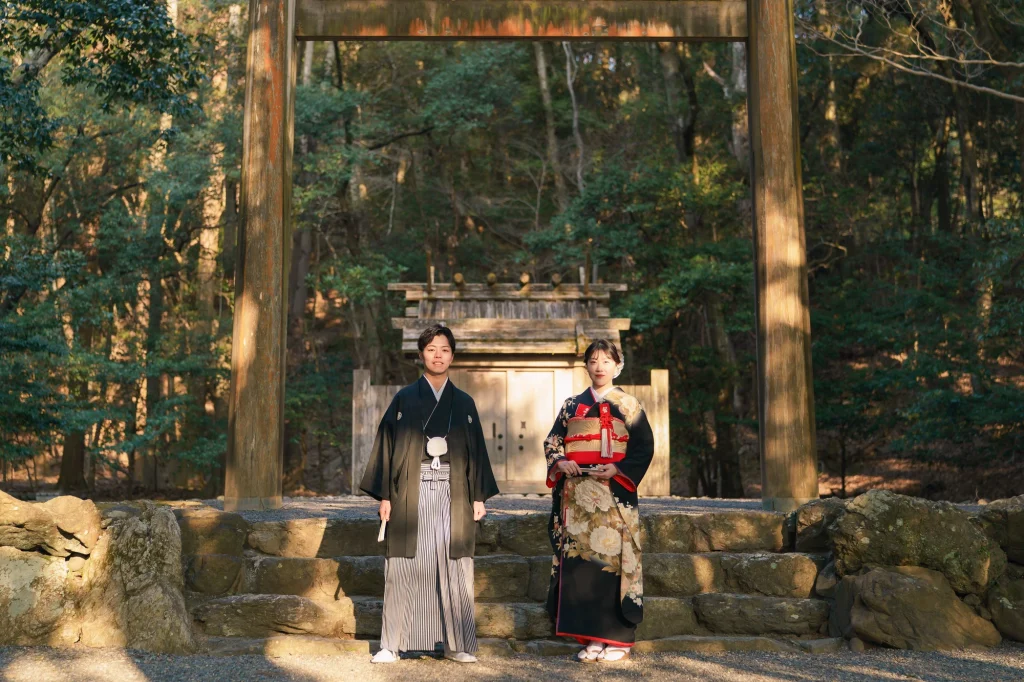 関西からお問い合わせいただいたおふたりは、結婚式の代わりに伊勢神宮での入籍奉告参拝を選ばれました。厳かな伊勢の地で、人生の節目を家族とともに迎える特別な一日。ご参拝はご家族含め14名で行われ、落ち着いた雰囲気の中で温かな時間が流れました。おふたりの装いは、黒の引振袖と黒の紋付袴。ともに武家の正装としての歴史を持ち、現代でも和婚や神前式で人気のある格式高い和装です。黒は高貴な色とされ、落ち着きと威厳を象徴し、結婚に対する強い決意を表すとも言われています。伊勢神宮の神聖な空気と調和し、伝統美が際立つお姿に、ご家族からも感嘆の声が上がりました。結婚式を行わずとも、特別な想いを形にできる「伊勢神宮 奉告参拝」は、和婚を考える方におすすめの新たな選択肢です。