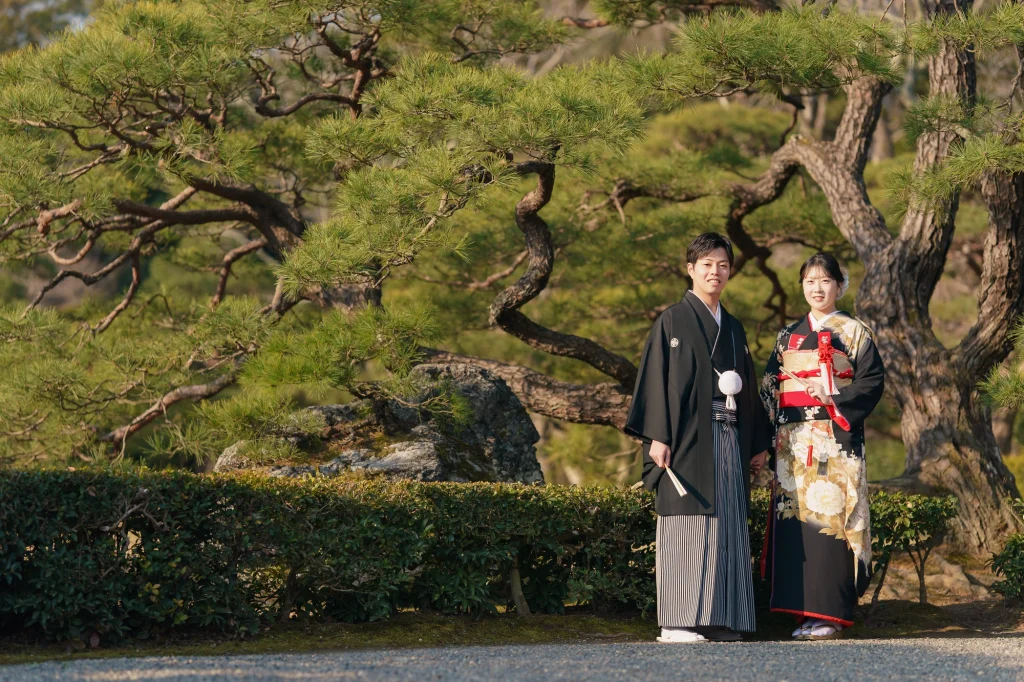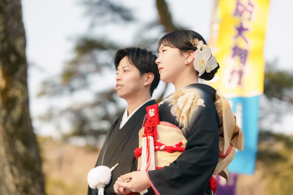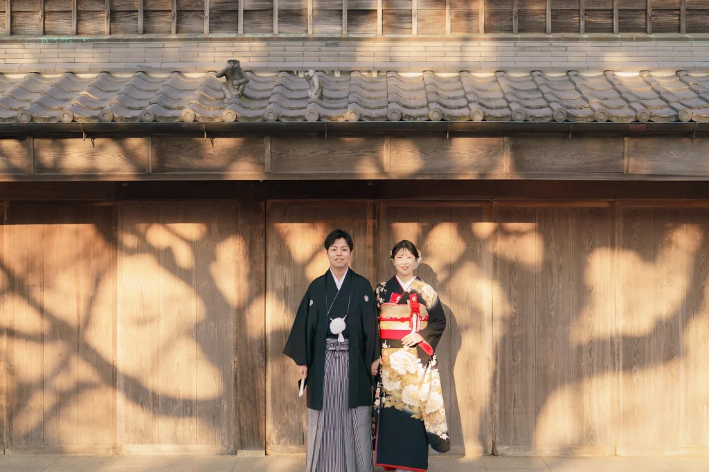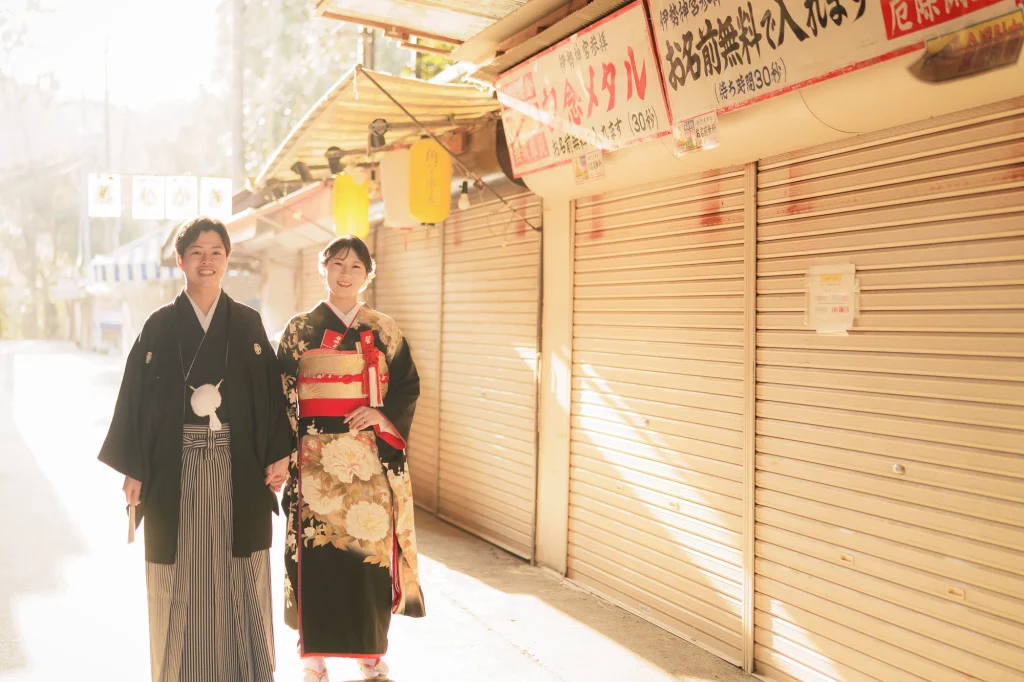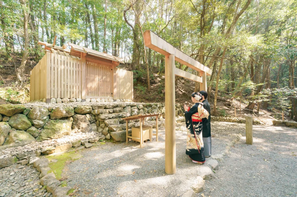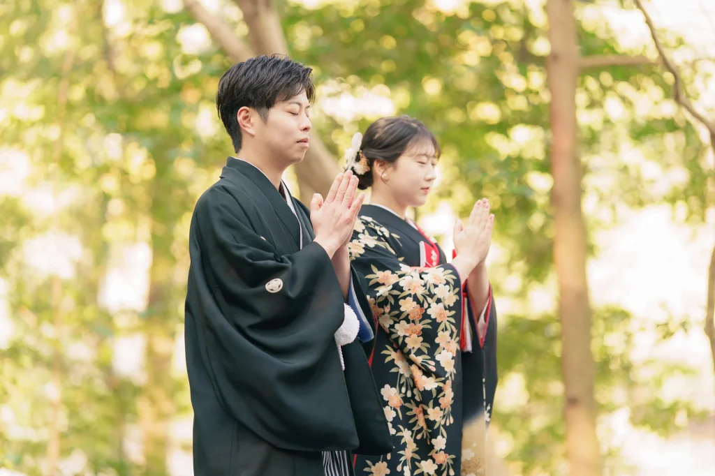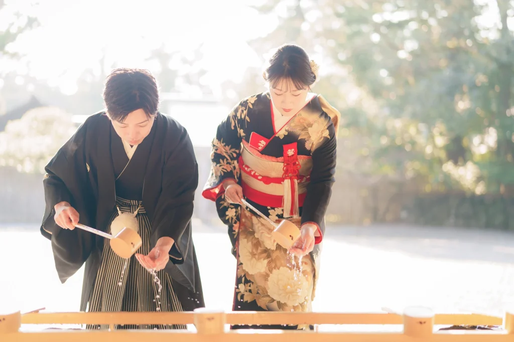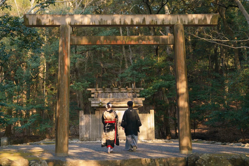 関西からお問い合わせいただいたおふたりは、結婚式の代わりに伊勢神宮での入籍奉告参拝を選ばれました。厳かな伊勢の地で、人生の節目を家族とともに迎える特別な一日。ご参拝はご家族含め14名で行われ、落ち着いた雰囲気の中で温かな時間が流れました。おふたりの装いは、黒の引振袖と黒の紋付袴。ともに武家の正装としての歴史を持ち、現代でも和婚や神前式で人気のある格式高い和装です。黒は高貴な色とされ、落ち着きと威厳を象徴し、結婚に対する強い決意を表すとも言われています。伊勢神宮の神聖な空気と調和し、伝統美が際立つお姿に、ご家族からも感嘆の声が上がりました。結婚式を行わずとも、特別な想いを形にできる「伊勢神宮 奉告参拝」は、和婚を考える方におすすめの新たな選択肢です。