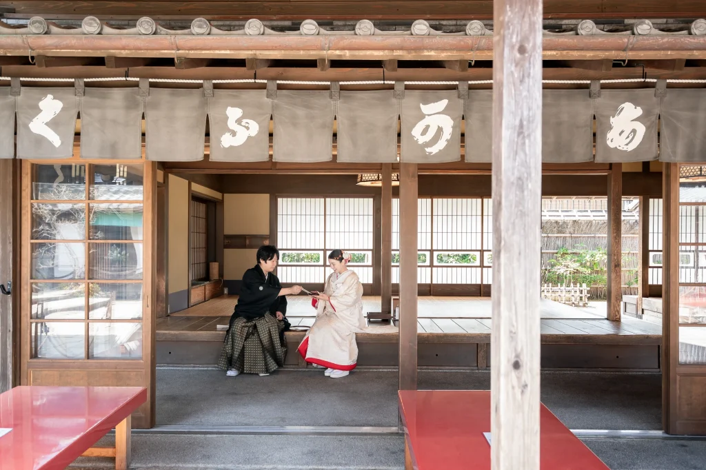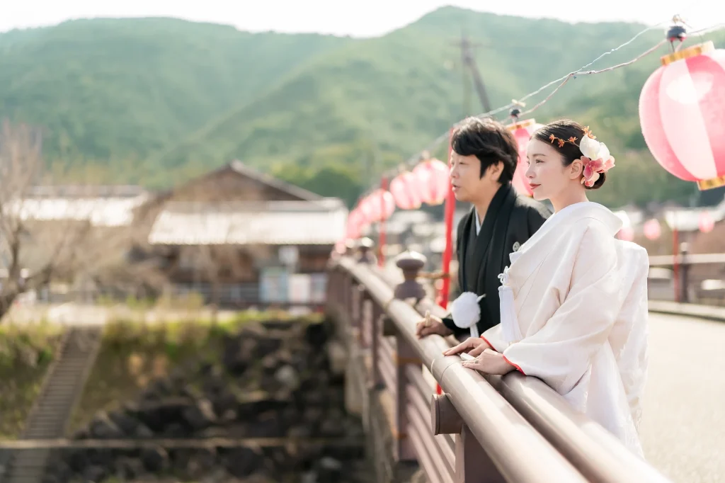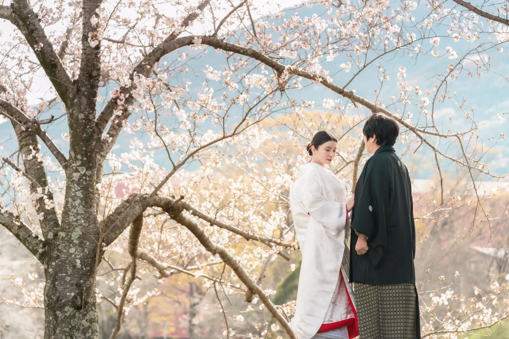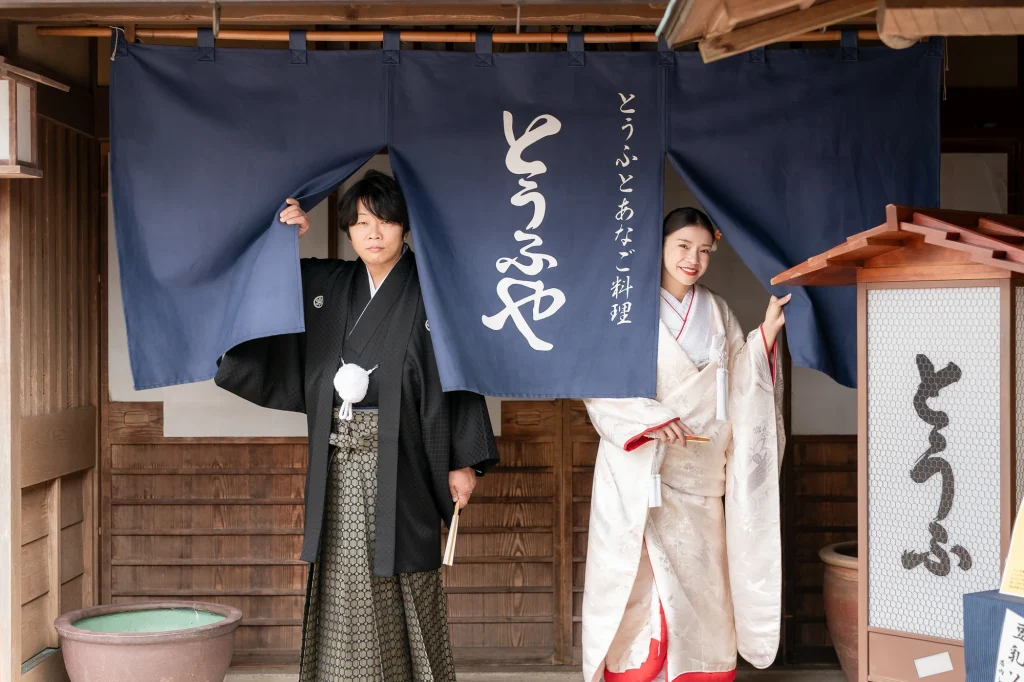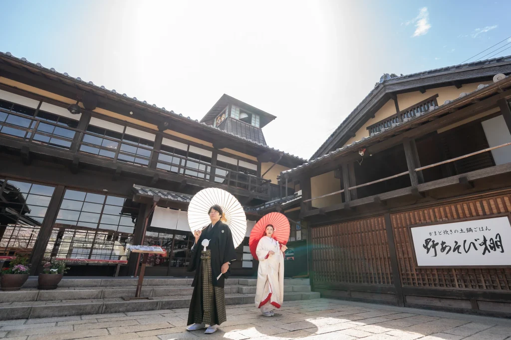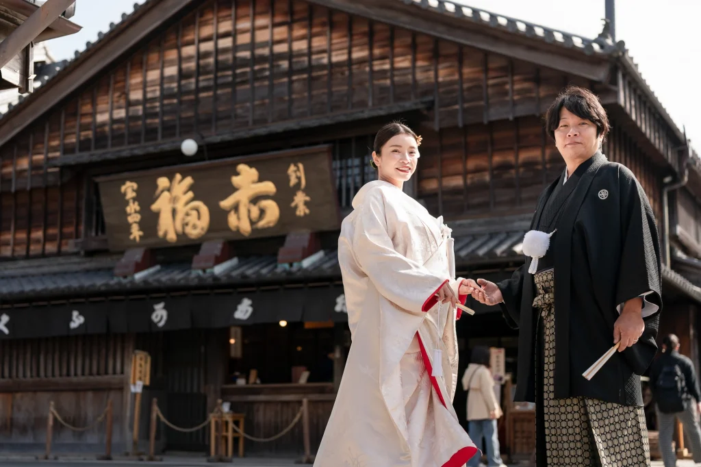 結婚式の1ヶ月前、おふたりは三重県伊勢市にある人気観光地「おかげ横丁」にて、念願の桜の前撮りを行いました。伊勢神宮のお膝元に広がるおかげ横丁は、江戸から明治期の風情ある建築が残る、三重を代表する観光スポット。その歴史情緒あふれる町並みに、花嫁様の白無垢姿が美しく映え、まるで時代を超えたワンシーンのような撮影が叶いました。桜の季節にこだわって日程を調整されたおふたりの想いが詰まった前撮りは、和婚ならではの魅力に満ちた特別な時間に。満開の桜と、伊勢路の伝統建築、そして白無垢の上品な佇まいが調和し、ご家族やご友人にも好評だったそうです。伊勢での和婚をご検討中の方や、和装の前撮りをお考えの方にとって、春の「おかげ横丁 桜前撮り」は特におすすめのロケーションです。